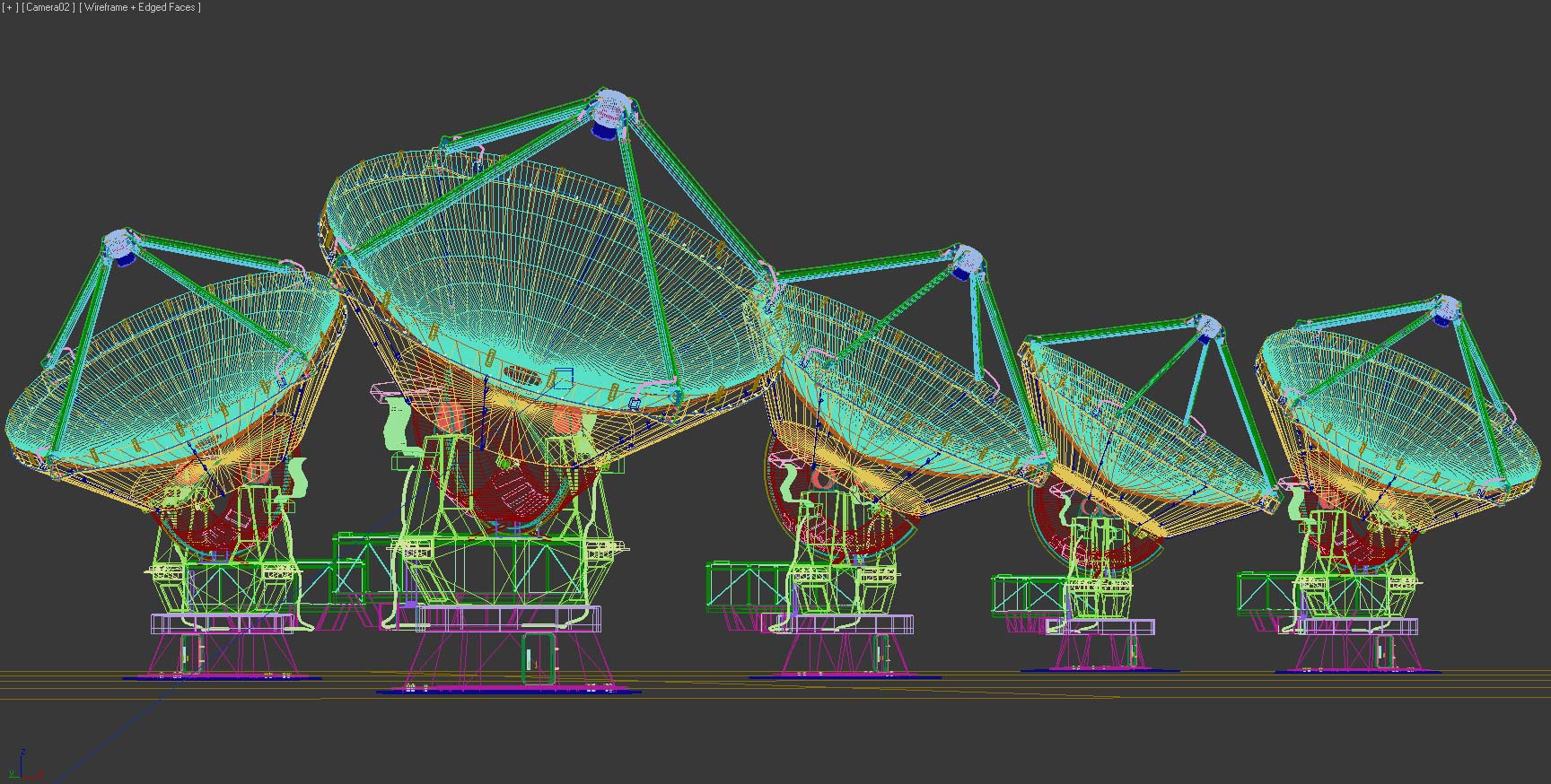 In the above image, I built an array of dishes that that I posed in various ways. I over did the modeling (as usual) and included the nuts and bolts on the dish arrays. I didnt know how close the camera would come to the dishes, but I wanted it to be able to come within a few meters with full detail. As always, I keep my maps above 4K to help ensure this.